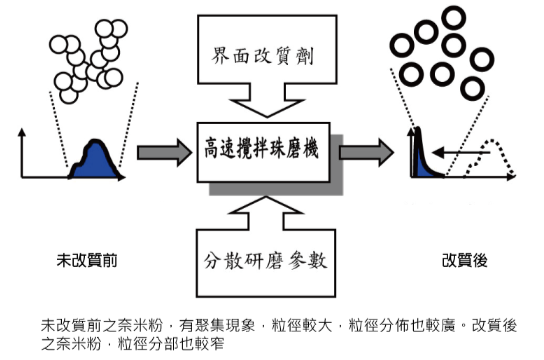 研磨機採用濕式分散研磨方法,漿料溫度之變化較不易因研磨而急速上升,再搭配研磨機之高攪拌速度,以縮短分散研磨及反應所需之時間。攪拌器之轉速、磨球之充填率、流量等,皆可以因需要而調整到最佳化之研磨條件。界面改質劑加入欲改質粉體漿料內,再依最終之粒徑要求來設定研磨機所需之消耗電力及比能量值,利用循環操作模式來做分散、研磨及界面改質之工作,研磨機於運轉過程中將自動累積所消耗之電力,如此可以確保研磨品質之均一性。